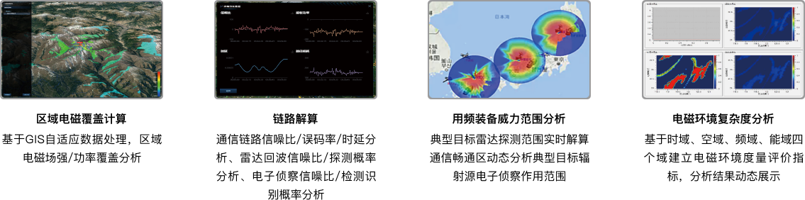 主要用于解决特定作战场景中雷达、通信、导航、电子战等电子信息系统辐射源面临复杂地理、气象、水文等环境下的电磁环境的构建、生成、度量评估和呈现问题,为电子信息系统的布站、电磁环境适应性评估、频谱电磁兼容性分析等提供有效支撑。